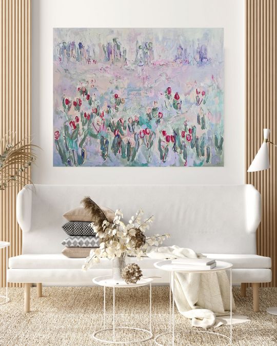 TASMANIAN TULIPS has been partially painted with eyes closed. It is one of the techniques I use in my meditative painting practice, in order to let go of negative thoughts or my inner voice comments.